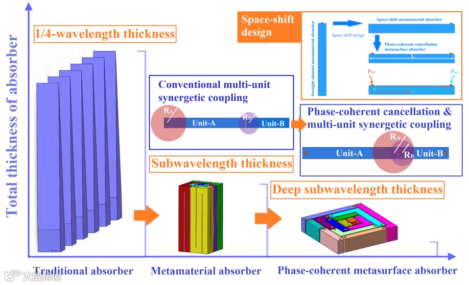 图 1 不同吸声结构对应厚度演变过程及空间尺寸转移超表面设计原理示意图