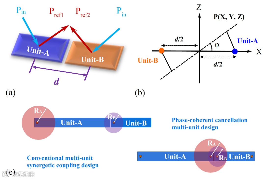 如图4所示,考虑两个具有一定反射相位差的超表面单元A和单元B,单元间的距离为d。入射声波Pin入射到单元A上产生的反射/散射声波为Pref1,入射到单元B上产生的反射/散射声波为Pref2。根据声波干涉原理,如果Pref1和Pref2之间相位相同,则会产生相干增强效果,而如果相位相反,则会产生相干相消效果。对于吸声超结构设计中常用的共振类单元,往往在吸声峰(对应共振频率)处会发生相位突变。因此,在相应的频带内相位差往往较大,不同单元产生的散射声场间的耦合相互作用增强。显然,这种相位关系是可以被有效利用的,如果单元间的散射声能量是相干相消的,则被单元反射的声能量降低,从而可导致吸声性能提高。由于声学超表面可以实现对波前相位的精确操控,因此将这种相位抵消原理应用于超表面中,实现吸声性能增强是一种非常合理的举措。