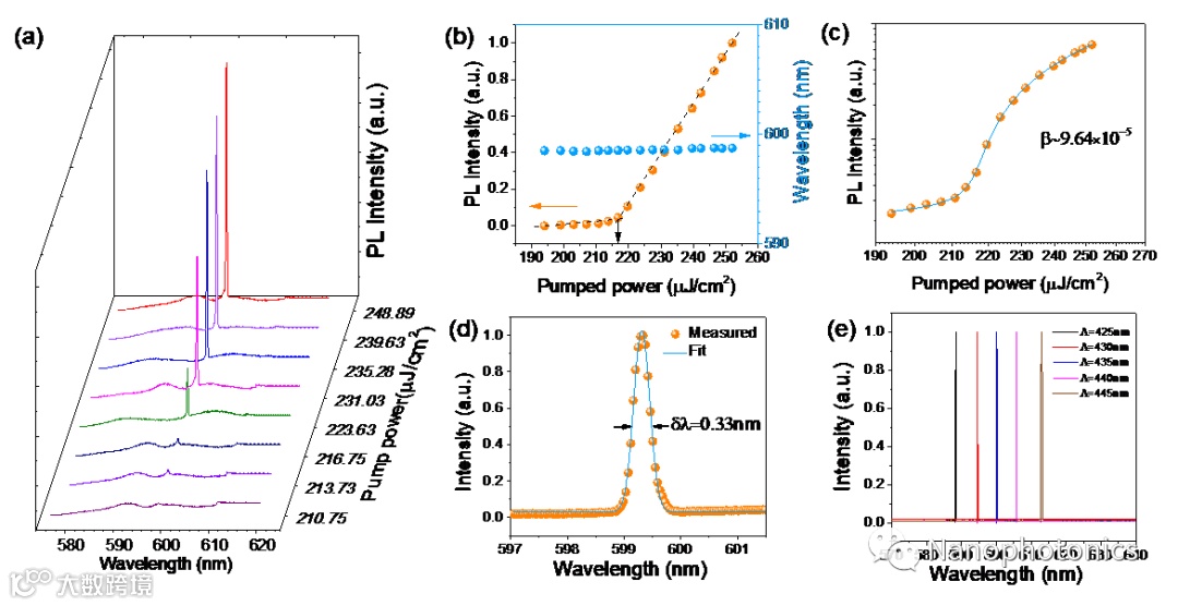 进一步的,研究人员制备了准BIC激光器件,并且表征了其性能。图3a是周期为435 nm的器件的归一化功率相关光致发光(PL)光谱,展示了从自发发射到激光的转变。激光器的阈值功率密度为216.75 μJ/cm2,自发辐射因子为9.64 × 10−5,线宽为0.33 nm。图3e给出了五个不同周期的光子晶体腔的激光光谱,其单模激光波长范围为588.4 ~ 611.9 nm,覆盖了23.5 nm。