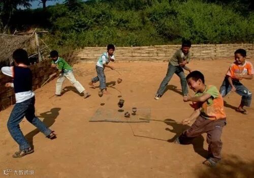 陀螺在农村随处可见,最常见的玩法儿是集体竞技。要想陀螺转得好,就得在削好的木质陀螺的头上钉上一个钢珠,鞭子一般都用发动机上的皮带做。