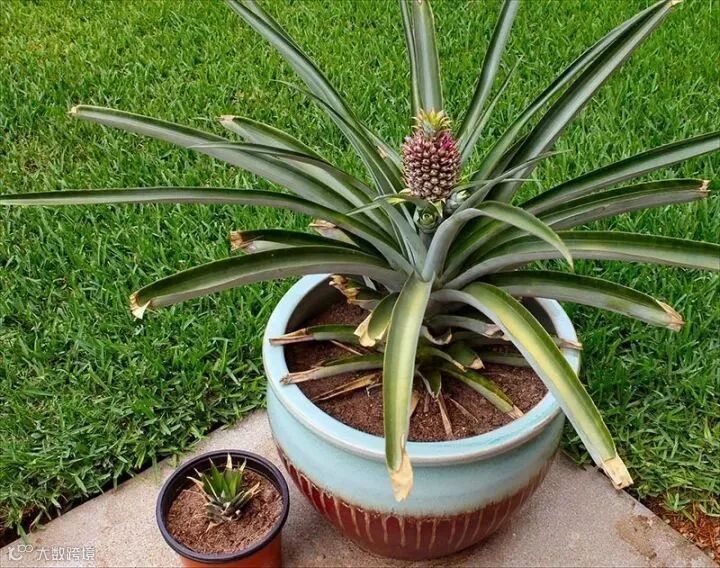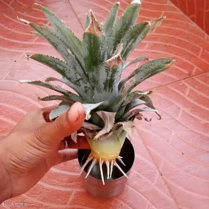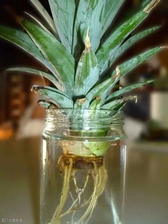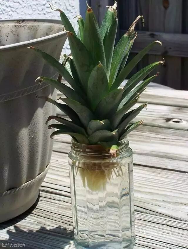 ④可以放置在透明的玻璃瓶中当水培盆栽,或者移植到土壤中,菠萝植株会越长越大棵哦~