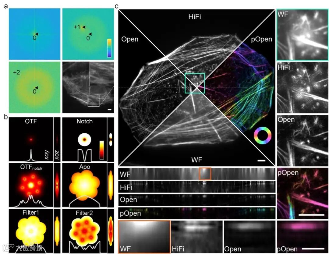 图1. a,低信噪比、低调制度条件下通过±1级与±2级频谱尖峰点进行协同参数估计。b,根据系统光学转换函数与估计的参数设计的各类频谱优化滤波器。c,Open-3DSIM与宽场图像(WF),单层3DSIM算法(HiFi-SIM)的对比以及基于Open-3DSIM的偶极子取向解析(pOpen)。