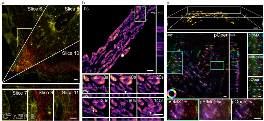 图2. Open-3DSIM建立横向/纵向超分辨、多色、动态、偏振的六维成像模态。a,重建多色Cos-7细胞样本,b,解析Cos-7细胞三维线粒体的分裂、融合、凋亡,以及c, 获得小鼠肾切片微丝结构的荧光偶极子信息。