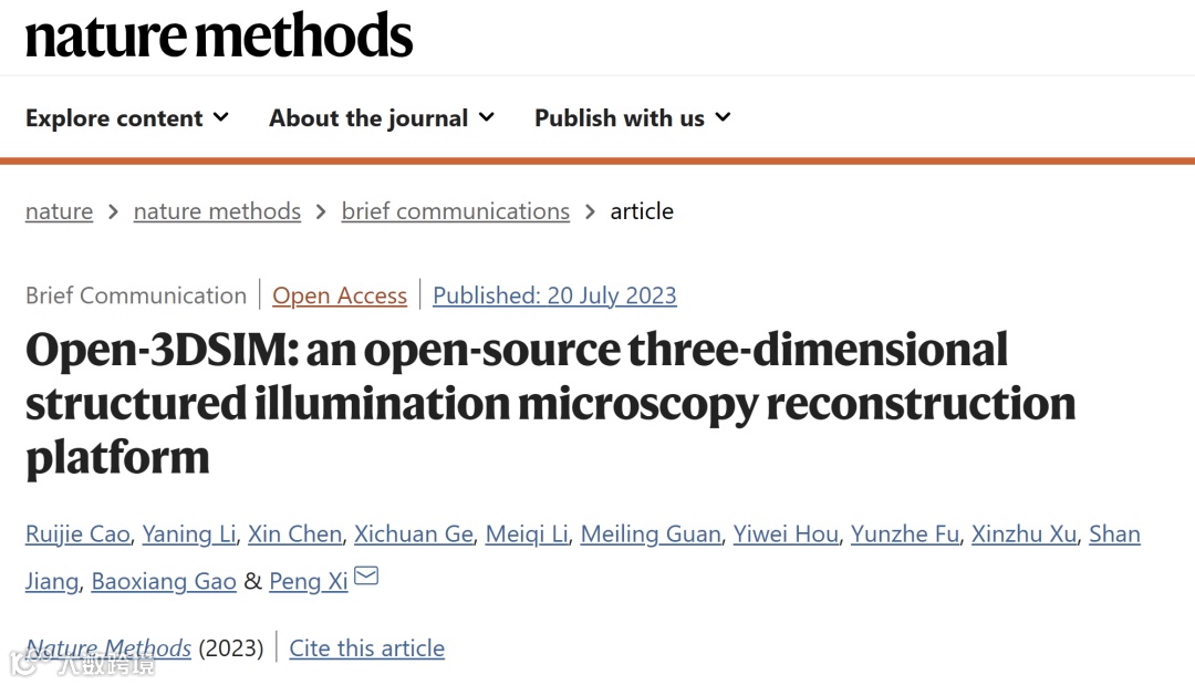 2023年7月20日,北京大学席鹏教授课题组在Nature Methods上发表了题为Open-3DSIM: an open-source three-dimensional structured illumination microscopy reconstruction platform的文章,继在提出开源2DSIM重建平台Open-SIM后(IEEE JSTQE2018),开发了全新的开源3DSIM重建平台——Open-3DSIM。