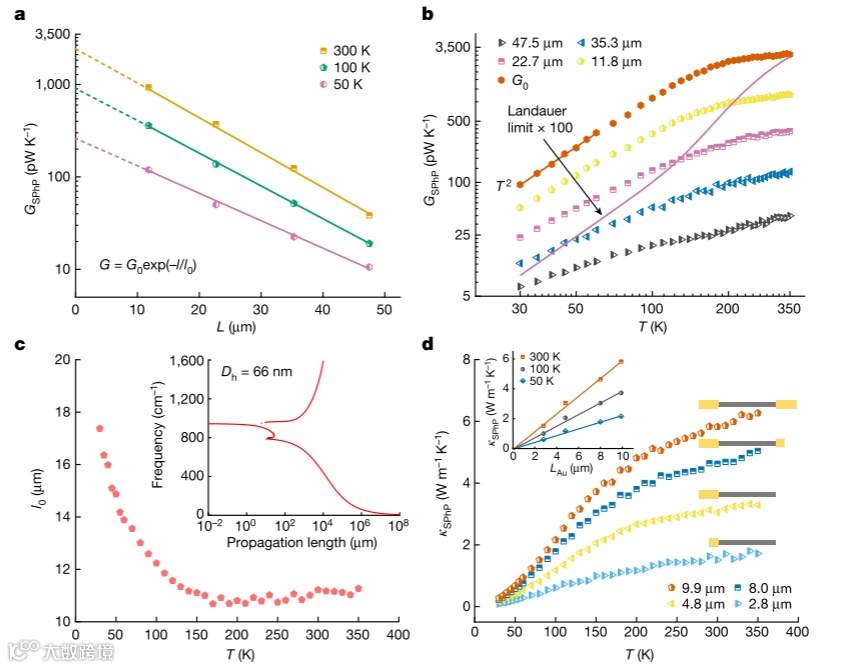 研究人员提取了涂覆Au层与未涂覆Au层的热导率差值作为SPhP的热导率(ΚSPhP)。通过实验测量,发现GSPhP具有与长度相关的衰减特性,GSPhP可以用指数函数GSPhP = G0exp(-l/l0)来描述,其中G0和l0分别是温度相关的前衰减热导率和衰减长度。