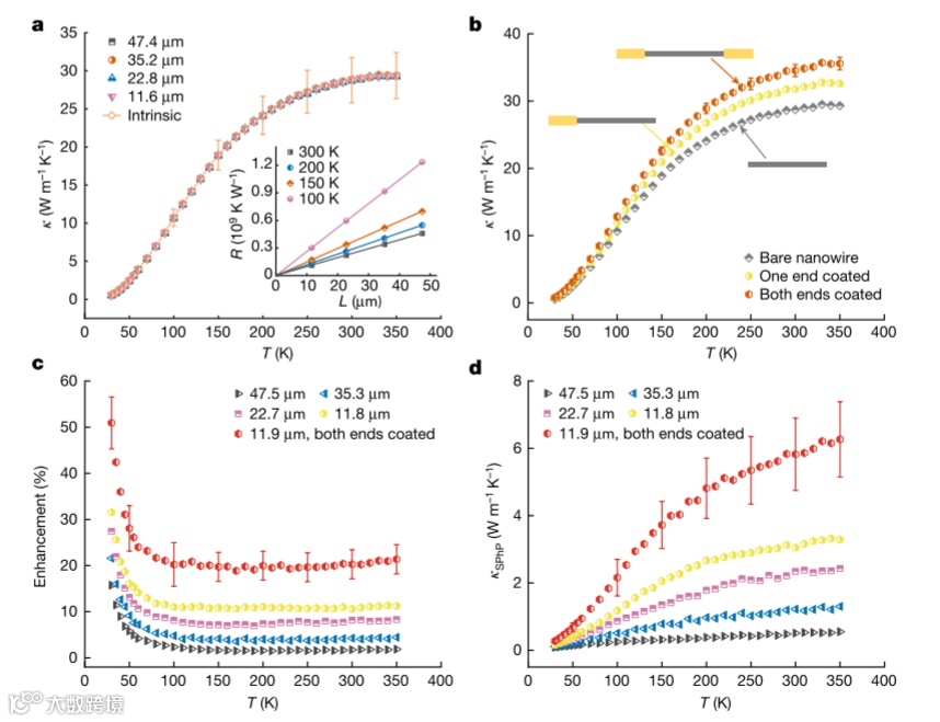 作者注意到,虽然在 300 K 时,仅证明两端具有总共 10 μm长的Au涂层的SiC纳米线的Κ增强约为 21.4%,但这种相对变化是相对于接近30 Wm−1 K−1的相当高的基线值而言的。在 300 K下实现的最高ΚSPhP 为 5.8 Wm−1 K−1 ,这是非晶介电材料的声子介导热导率的三倍多并被视为器件热管理的瓶颈。由于SPhP也被认为存在于这些薄膜中,因此有目的地将SPhP引入具有金属发射器的微电子器件中是一种管理热流以消除热点的有前途的方法。值得注意的是,在作者的测量中,Au涂层长度仍然比 SPhP 衰减长度短得多,这一事实表明SPhP的贡献尚未饱和。高G0还表明,对于较短的线长度,可以实现超过5.8 W m−1 K−1的ΚSPhP。总的来说,金属涂层驱动的SPhP 介导的非平衡热传导的发现为使用 SPhP 操纵热传输打开了大门。