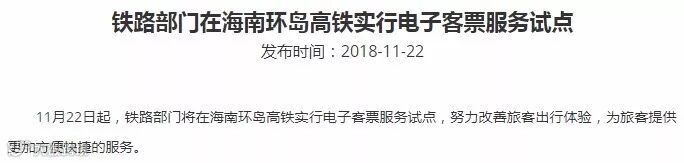 11月22日中国铁路总公司官网称,自11月22日起,铁路部门将在海南环岛高铁实行电子客票服务试点。