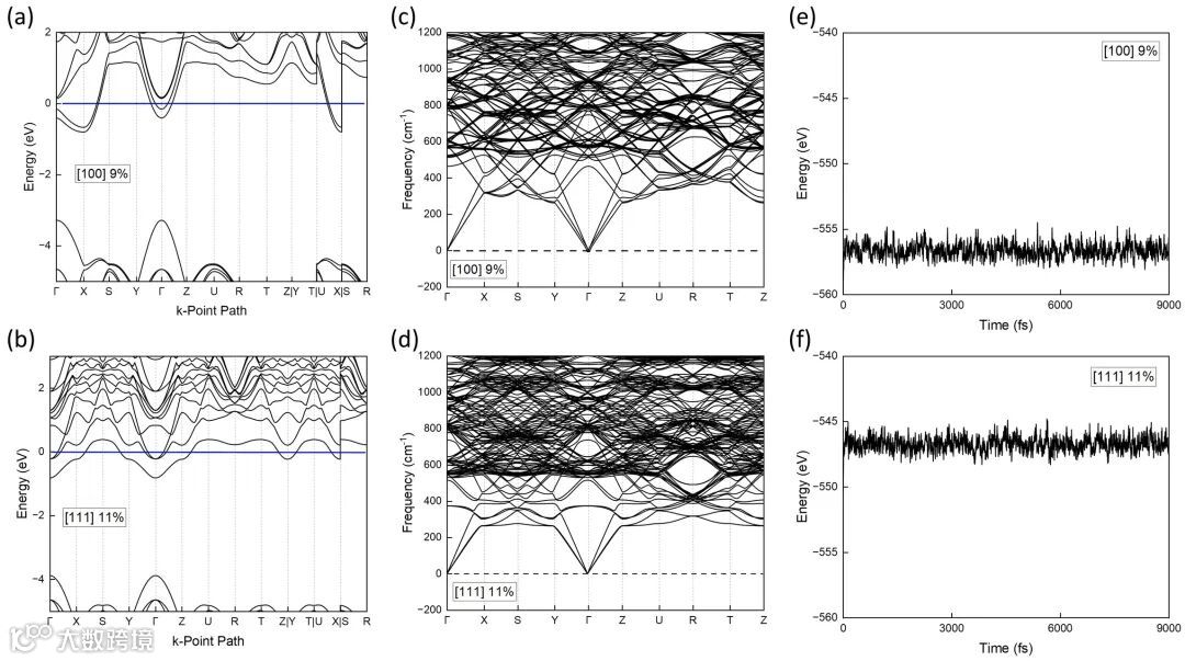 图 3:[100]方向9%或[111]方向11%压缩应变下模拟得到的氮掺杂金刚石的能带图、声子谱、以及热稳定性(300K)。