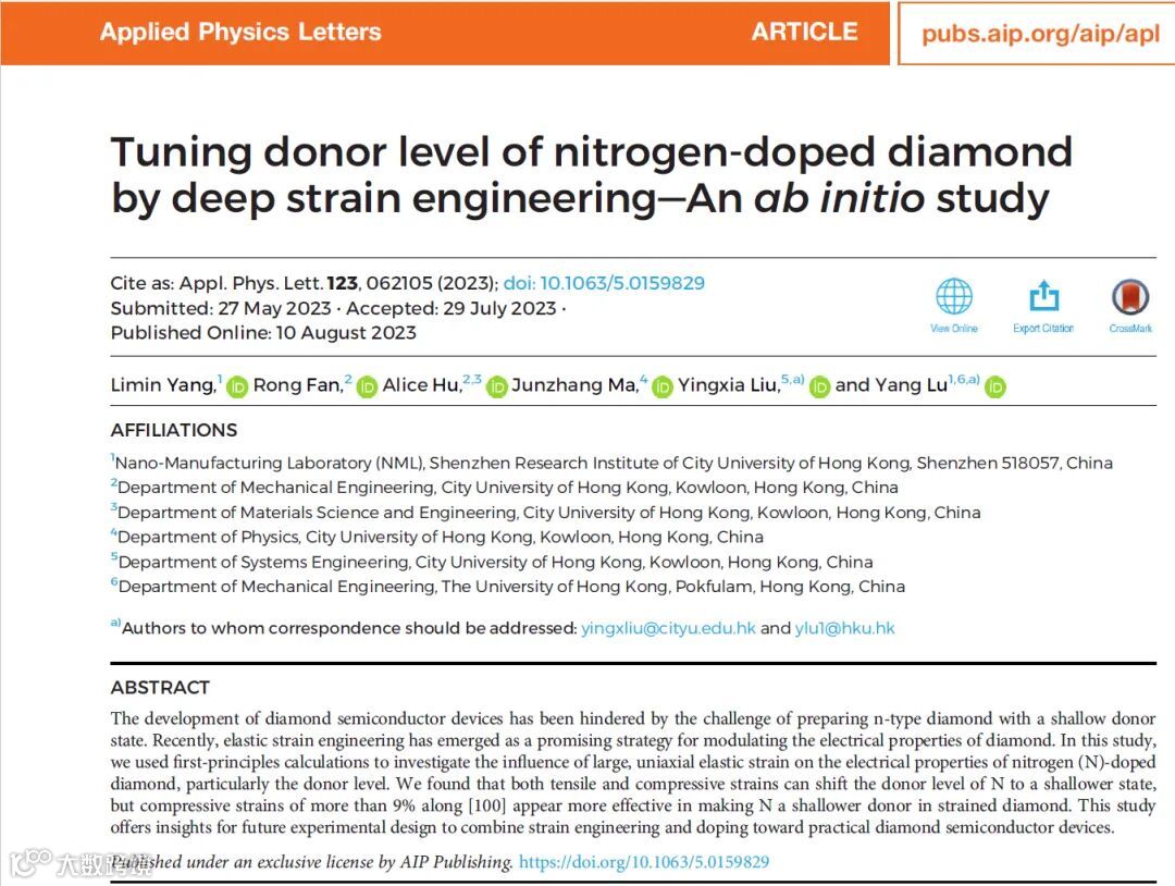 2023年8月10日,香港大学陆洋教授团队与香港城市大学刘影夏等合作者在著名物理期刊Applied Physics Letters上发表了题为“Tuning donor level of nitrogen-doped diamond by deep strain engineering – An ab initio study”的最新研究成果。该工作采用第一性原理计算的方法,研究了在深度弹性应变作用下,氮掺杂金刚石的施主能级变化以及调控。