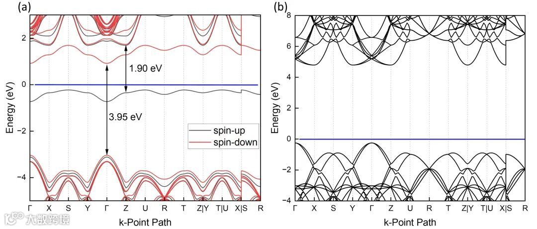 图 1:氮掺杂金刚石(a)以及未掺杂金刚石(b)的能带图计算结果。