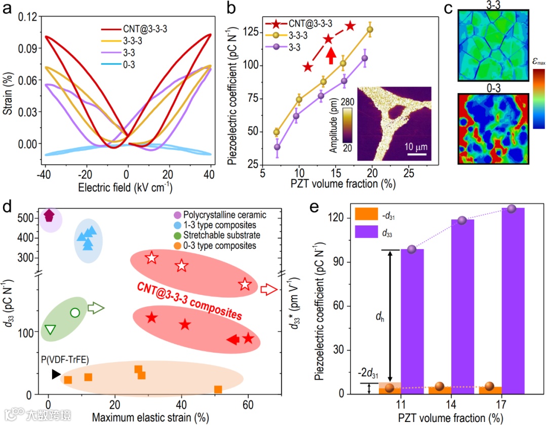 低填料含量下连续的极化通路与应力传递通路的形成使3-3-3连通性的压电复合材料表现出了接近块体陶瓷的压电响应(250 pm V-1,120pC N-1)与优异的机械柔性。