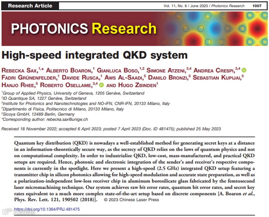 在Photonics Research期刊2023年第6期中,日内瓦大学的Hugo Zbinden领导的研究团队描述了他们最新的QKD系统。该系统采用了集成光子学技术,除了激光器和探测器之外,所有组件都被集成到一块芯片上。这一创新设计具有紧凑、低成本和易于大规模生产等诸多优点,图1所示。美国光学学会的OPG Newsroom以Chip-based QKD achieves higher transmission speeds为标题发布该论文的Press Release。