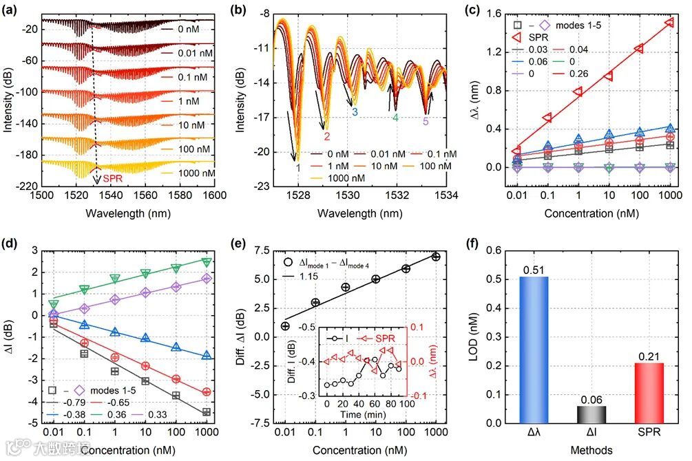 图1 基于TFBG-SPR的Cd2+传感器的光谱响应和检测限比较。(a)TFBG-SPR传感器在各种Cd2+浓度下的光谱演变。(b)SPR区域周围的光谱局部放大图。(c)SPR包络以及五种选定包层模式的波长漂移以及相应的线性拟合。(d)SPR包络以及五种选定包层模式的振幅变化以及相应的线性拟合。(e)模式1和模式4差分后的振幅变化。(f)模式3的波长漂移和SPR包络以及差分振幅计算所得检测限。