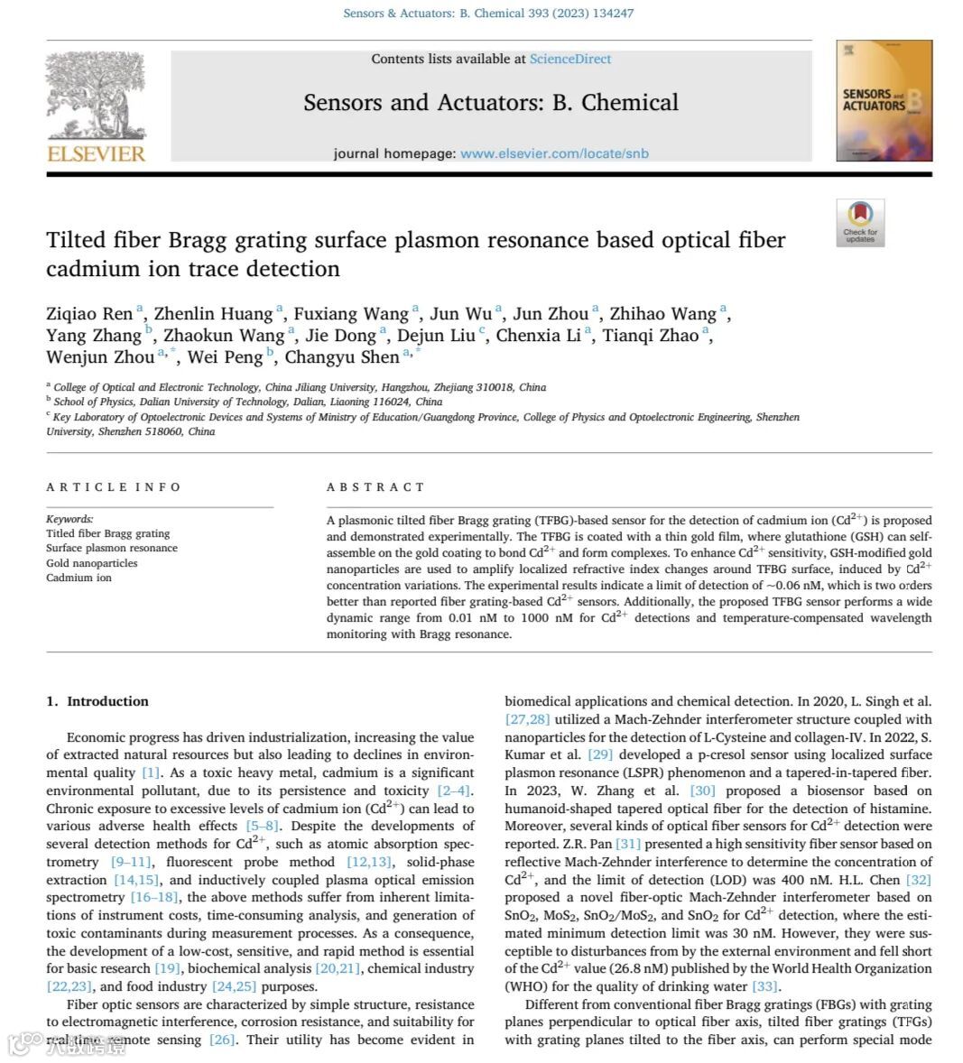 Ren Z, Huang Z, Wang F, et al. Tilted fiber Bragg grating surface plasmon resonance based optical fiber cadmium ion trace detection[J]. Sensors and Actuators B: Chemical, 2023, 393: 134247.