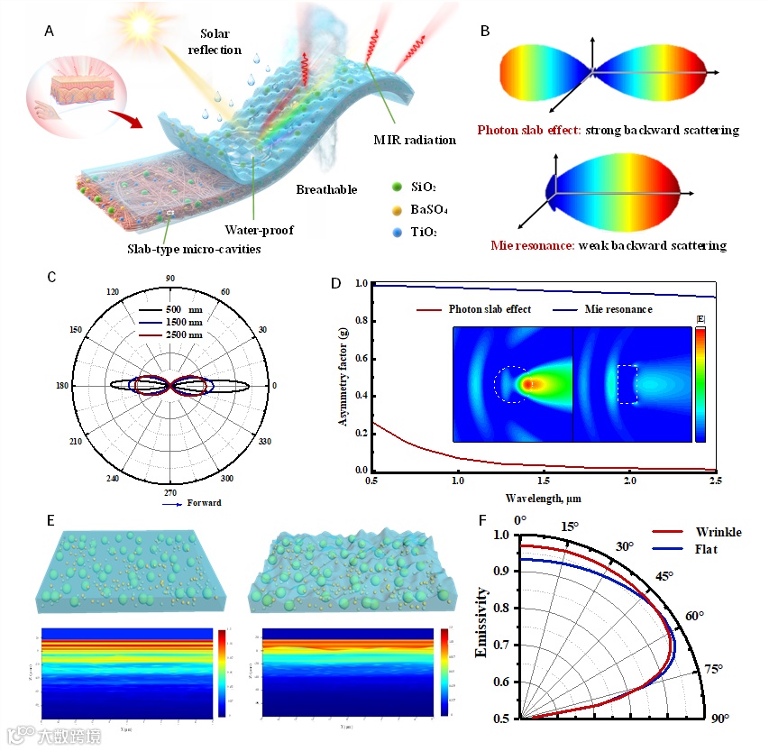受人体皮肤(表皮和真皮层)的启发,本文提出了一种适用于PDRC的双波段光学特性定向设计策略,使用了具有微米粒子、板状等级孔、仿生褶皱微结构及交错排列的纤维。通过模仿人体皮肤(表皮和真皮层)的微观结构,获得了超高的大气窗口发射率和优异的柔性与强度。基于电磁理论设计了板状等级孔,与球形孔激发的Mie共振相比,板状等级孔能表现出强烈的后向散射和超高的太阳光谱反射率。此外,优化的板状等级孔还具备防水透气性。通过简单、可规模化的浸染工艺,即可制备出一种高效的仿生辐射制冷织物。该织物的太阳光谱反射率和大气窗口发射率均可达到97%,并且表现出优异的透气性、防水性、柔韧性、强度和耐久性。