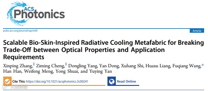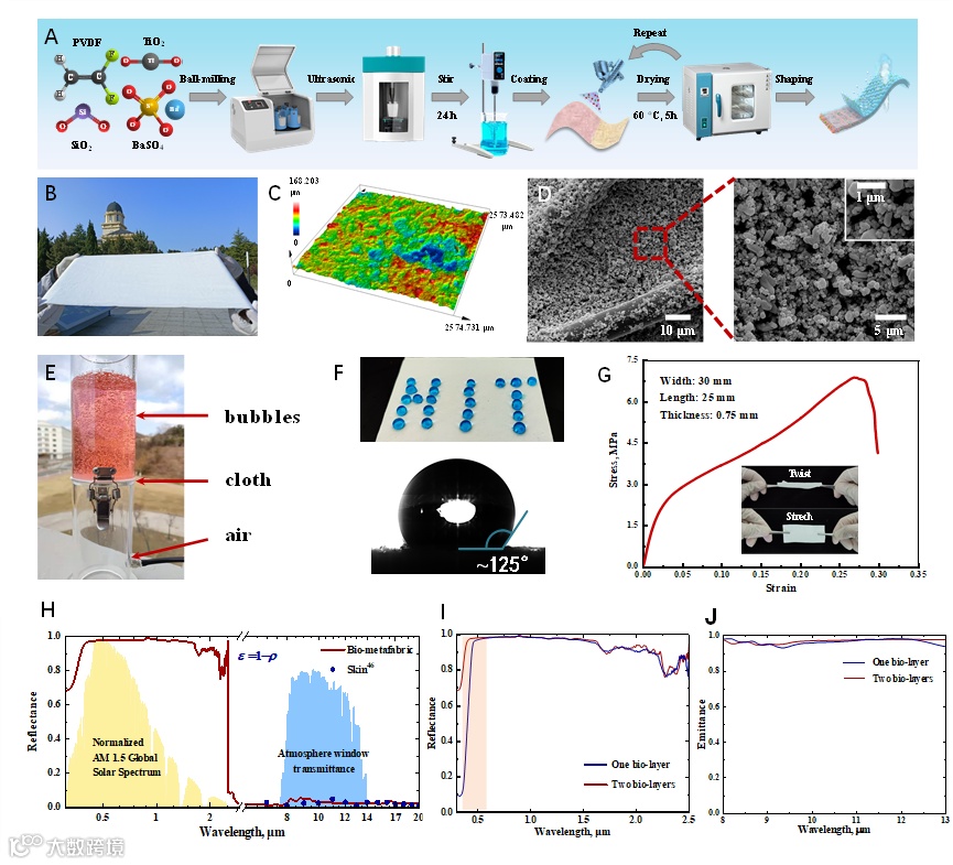 日间辐射制冷(PDRC)技术是一种环境友好型的零能耗被动式制冷技术,能够有效减少当前人类用于制冷的能源消耗,从而缓解能源与环境危机,具有广阔的应用前景。PDRC的主要技术指标是实现超高的太阳光谱反射率和超高的大气窗口发射率,同时在某些特殊的应用场景中(如服装、帐篷等),需要考虑透气性、防水性、柔韧性、强度和耐久性等性能。而目前的辐射制冷织物虽然能够满足实际应用中的防水透气需求,但光学特性相对较差。因此,打破超高双波段光学特性与多种应用需求之间的兼容壁垒是PDRC面临的一大挑战。