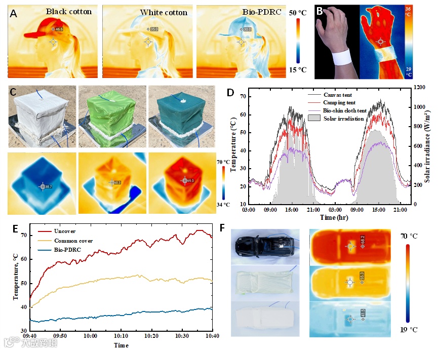这种仿生辐射制冷织物可以被制成可穿戴产品,如帽子、口罩和衣服,用于炎热的天气的个人热管理。在太阳直射下,穿戴仿生辐射制冷织物帽子时人体头顶部温度比戴黑色和白色棉帽时温度分别低16.6°C和5.0°C。在另一项测试中,将仿生辐射制冷织物制成了一个迷你帐篷。与传统露营帐篷(聚氨酯)和帆布帐篷相比,仿生辐射制冷织物帐篷顶部表面的温度分别降低21.6°C和30.3°C,而帐篷空腔内空气的最大降温分别为17.2°C和24.4°C。在1小时的汽车模型室外降温测试中,被仿生辐射制冷织物覆盖的汽车模型的腔体内最高温度比不覆盖任何织物的汽车模型温度低32.9℃,比覆盖聚氨酯(含银基底)的汽车模型低12.9℃。