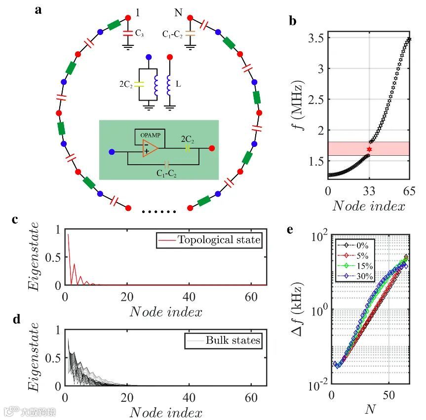 研究人员制备了四种不同长度的非厄米拓扑电路,包括N=7、N=11、N=15和N=19。图2a展示了N=19的电路样品。通过测量电路阻抗相应,可以得到由边界扰动导致的电路拓扑零能模频移,如图2c所示。四种不同颜色的线与四种不同长度的非厄米拓扑电路相对应,所测得的阻抗响应均位于电路的边界格点。此外,红色矩形标注了拓扑带隙的频率范围, 该频率范围内的阻抗响应显示在了图2d中。其中红色虚线用来标记开放边界下电路中拓扑零能模的频率。上述结果清楚地表明,与拓扑零能模对应的阻抗峰的频率偏移随着电路长度的增加而明显增加,这意味着电路长度的增加将带来敏感性的显著增强。图2e中的蓝线进一步说明了测量的频率偏移和电路长度之间的关系。与之相对应的理论模拟结果(红线所示)与实验结果之间有着良好的一致性。