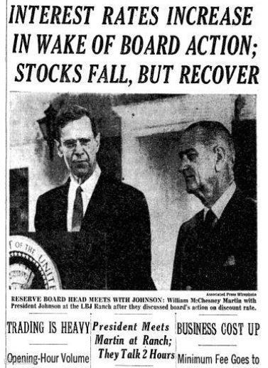 1965年12月,马丁不顾约翰逊总统“撤职”的警告,推动美联储继续加息,导致美股市场下跌。被激怒的约翰逊总统将马丁招到私宅,要求他解释为何藐视总统。