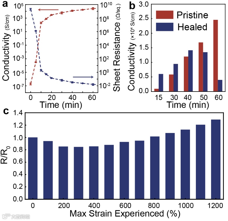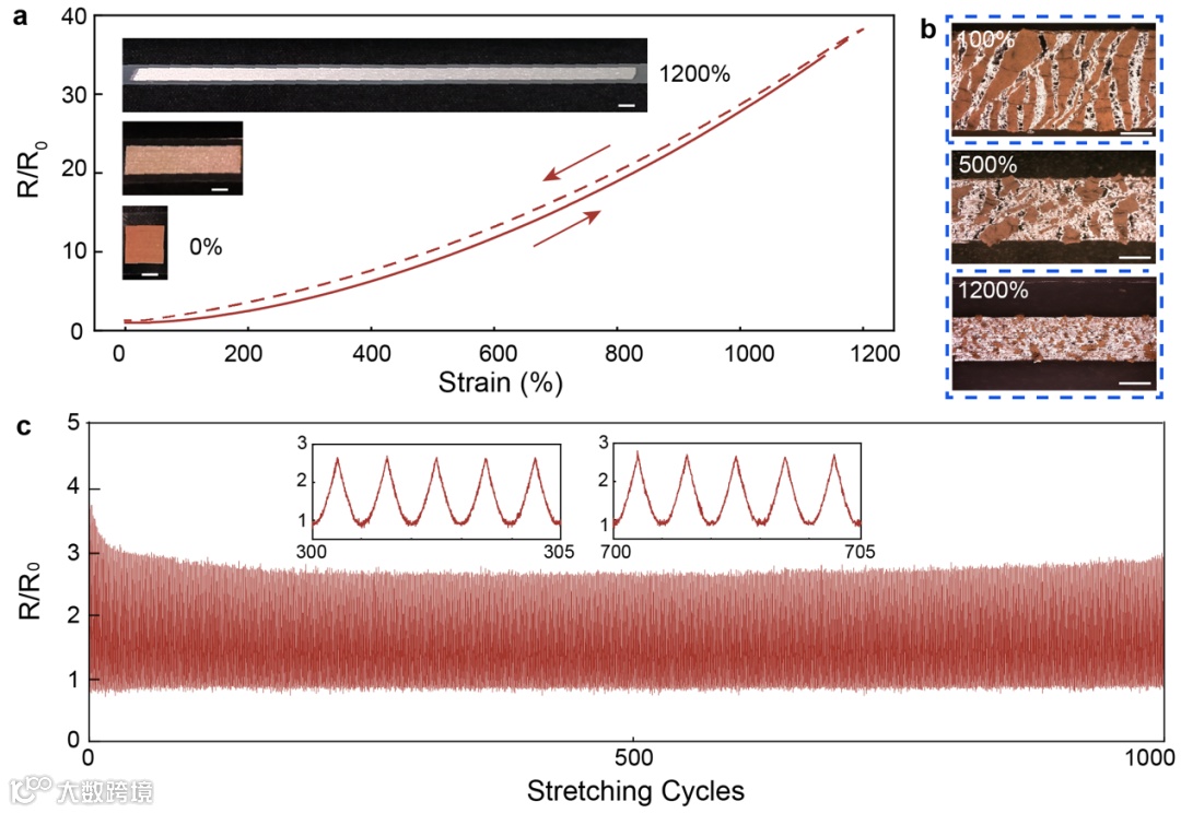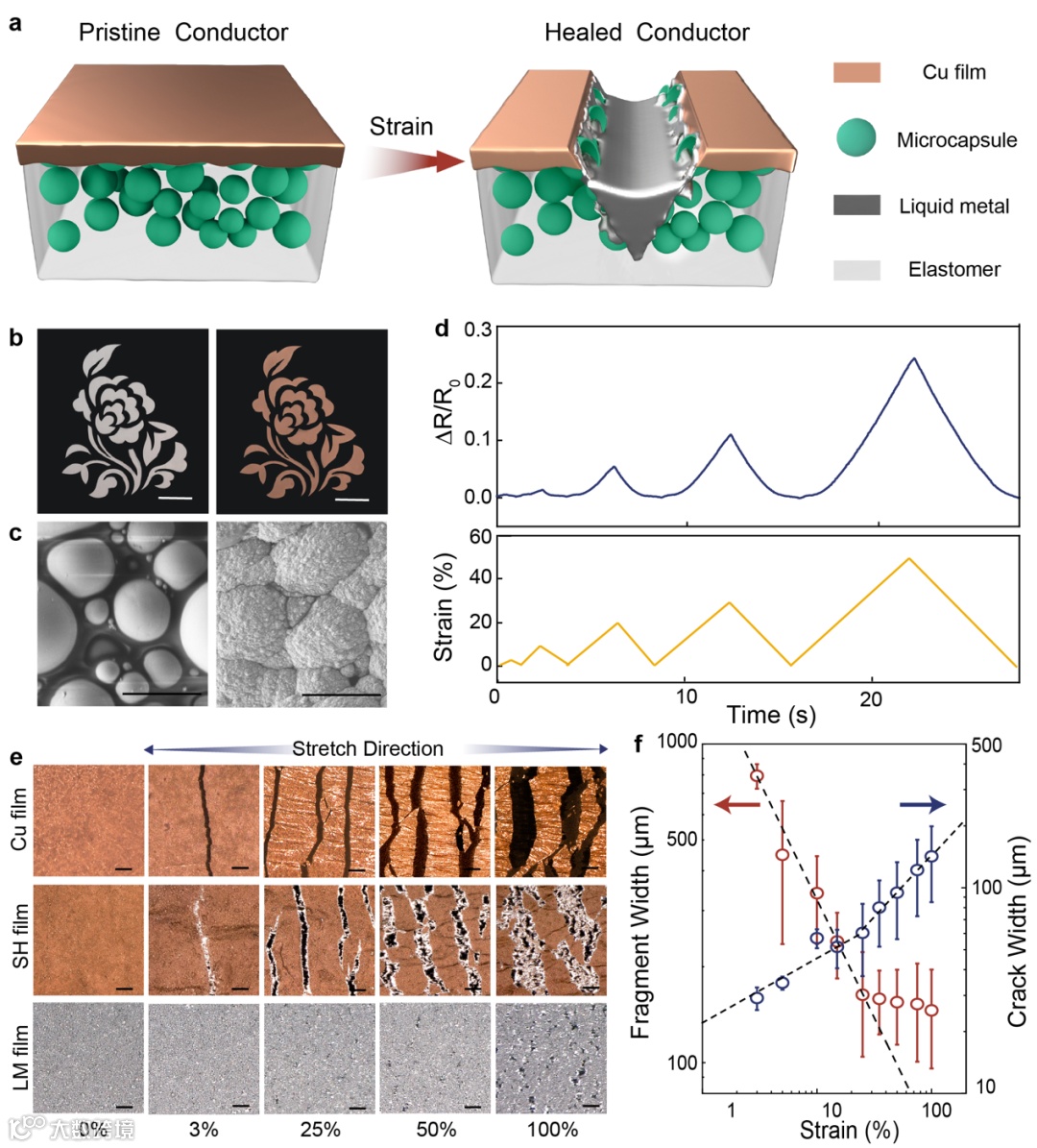 综上所述,铜膜在很低的拉伸量下会发生脆性断裂导致电路失效,而液态金属膜层随机、低效的破碎模式在理论上又无法及时弥补电学失效,为此在液态金属膜层上共形生长出铜膜,两者具有强烈的力学耦合,在铜膜产生微裂纹时,微裂纹的尖端应力场瞬间撕碎液态金属颗粒,在裂纹出选择性释放出液态金属,可以愈合极低形变量造成的电学损伤。这样的通用设计方法显著提高了导体的自愈和敏感性和效率,在柔性可拉伸电子器件中有广泛的应用潜力。