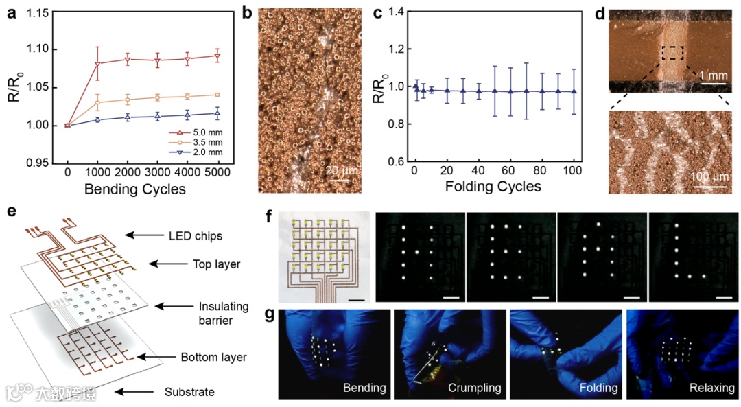 自愈合导体在经历从3%到50%逐步递进的循环拉伸时,导体的电阻在拉伸时稳定地增长,在回弹时几乎可以完全恢复到初始值,表现出稳定的电学性能(图1d)。与此形成鲜明对比的是,传统的铜膜在经历3%的小拉伸时就已经彻底失去了导电性能。将液态金属颗粒层在化学镀膜前进行拉伸,通过弹性衬底对液态金属颗粒的力学传导实现液态金属颗粒的破裂,发现需要大约30%的拉伸量才可以形成导电网络,这远远大于传统铜膜的失效点,说明依赖弹性衬底的力学传导并不能及时修复破碎的铜导体。常规无电镀铜膜具有机械脆性,在3%的拉伸量下就彻底断裂,而自愈合导体也会形成和传统铜膜类似的裂纹。可以清晰地看到在裂纹处释放出了大量的液态金属,连接了破碎铜层,起到电学愈合的效果(图1e)。实验中还研究了液态金属颗粒膜层在拉伸时的微观形貌。液态金属颗粒膜层会随机地发生破碎释放出液态金属。正是这种低效的破碎模式导致了液态金属颗粒复合物需要很高的拉伸量才可以形成导电网络。