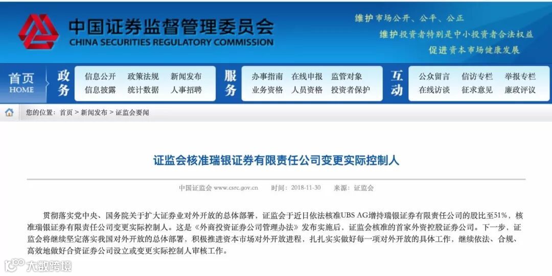 30日,证监会发布消息称,近日依法核准UBS AG增持瑞银证券有限责任公司的股比至51%,核准瑞银证券有限责任公司变更实际控制人。这是证监会核准的首家外资控股证券公司。