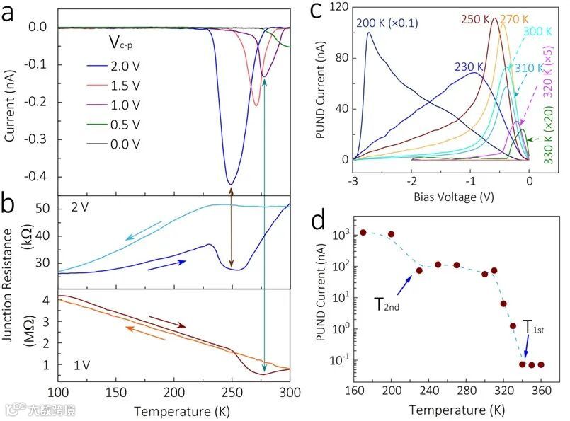 图3:(a) 在施加不同的极化电压后,从100到 300 K加热时的热释电响应。电极化是通过在0–2 V的偏压范围内将异质结冷却到100 K来实现。(b) 在1和2 V的偏置电压下,结电阻与温度之间的函数关系,其中温度下先降到100 K,然后上升到300 K。(c)在不同温度下的PUND响应。(d) PUND电流的温度依赖性,显示了第一和第二类铁电转变温度。