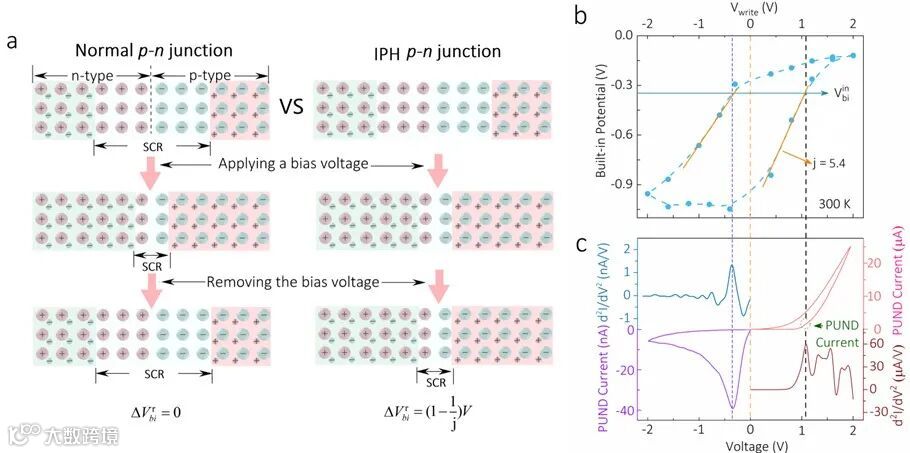 图2:(a) 显示正常和类铁电异质结的内置电势对偏置电压的依赖性的示意图。(b)在300K下的Vbi偏置迟滞回线,表现出非易失性电极化。(c) 通过PUND方法检测到的位移电流。电压脉冲的间隔时间为0.2s。PUND电流的二阶导数(d2I=dV2)如左上和右下所示,以排除背景电流的影响。