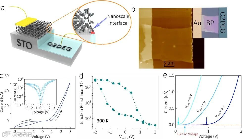 图1:(a)BP-Q2DEG异质结构的结构示意图。(b)原子显微镜图像,显示异质结的表面形貌。插图:异质结的显微镜照片。(c)在300 K时,−3–3 V的偏置范围内测量的电流-电压回线。插图:半对数电流-电压回线。箭头显示了电压变化的方向。(d)结电阻与写入电压Vwrite之间的依赖关系,Vread = 0.2 V,其中Vwrite是用1 s的脉冲宽度驱动器件的脉冲电压。Vwrite和Vread之间的等待时间为30 s。(e)在0、−5和5 V的Vwrite脉冲之后,在0–2 V的偏置范围内电流-电压曲线。箭头标记开启电压。