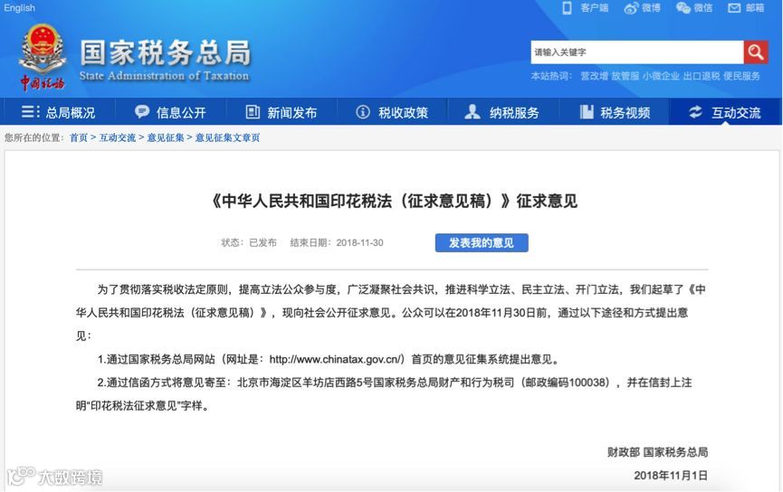征求意见稿说明中指出,制定印花税法,有利于完善印花税法律制度,增强其科学性、稳定性和权威性,有利于构建适应社会主义市场经济需要的现代财税制度,有利于深化改革开放和推进国家治理体系和治理能力现代化。