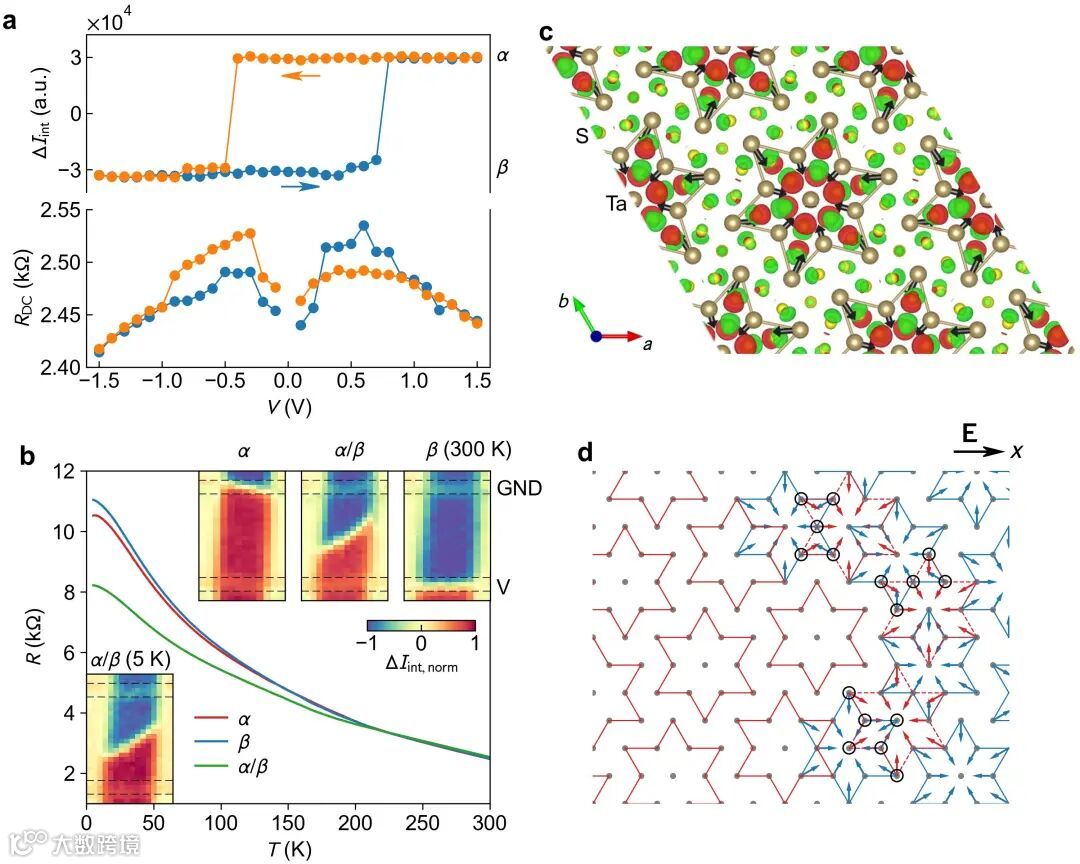 团队进一步发现,铁转序取向态翻转的过程可对器件电阻产生影响(图4a, b)。场冷极化过程中畴壁只出现在低电势电极一端,且在等温翻转过程中畴壁均沿着电场方向运动,表明电场与畴壁发生作用。结合第一性原理计算,团队提出电学翻转的机理是外加电场作用于畴壁处电荷密度波晶格畸变感生出的局域电偶极子,通过改变局部的畸变来实现畴壁的运动(图4c, d),而电场不与铁转序本身发生耦合。