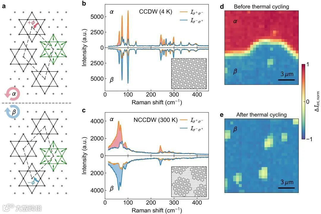 图1.(a)CDW晶格畸变形成的两种铁转取向态;(b, c)利用拉曼光谱鉴别CCDW和NCCDW相的两种铁转取向态;(d, e)铁转畴的拉曼成像图。