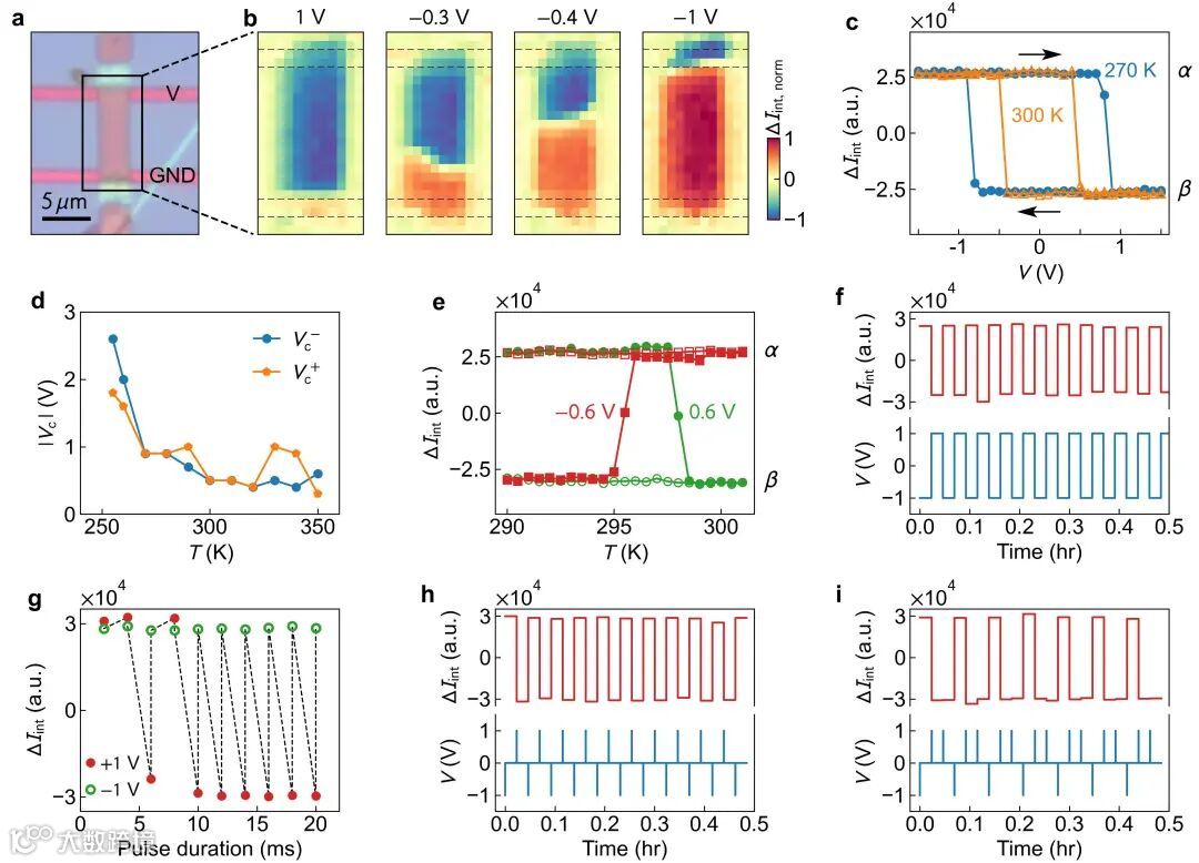 图3.(a, b)二电极器件光学照片及电压驱动畴壁运动的拉曼成像图;(c)270 K和300 K拉曼光谱积分值随电压的变化;(d)矫顽电压绝对值的温度依赖;(e)± 0.6 V 拉曼光谱积分值随着温度的变化;(f)重复性测试;(g-i)利用脉冲电压驱动铁转取向态翻转。除非特别说明,测量温度为室温。