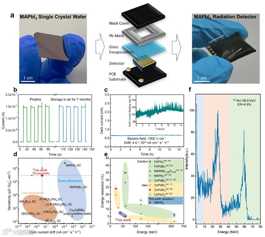)钙钛矿单晶片,并制备了超低电压驱动的高分辨伽马射线能谱探测器。
