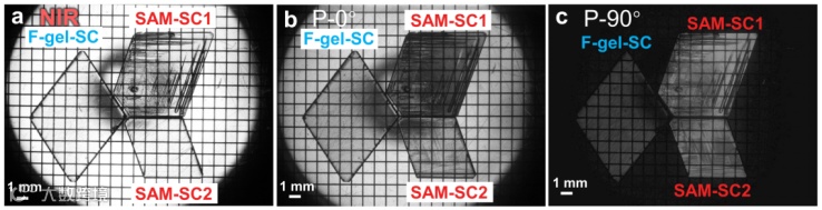 此外,作者还开发一种利用红外偏光成像系统观察晶体内部缺陷和晶畴的方法。如图2所示,在F-gel基底上生长的晶体具有高度统一排列的晶畴,具有更高的结晶性和更低的晶体缺陷密度,这为实现高性能辐射探测器提供了材料基础。