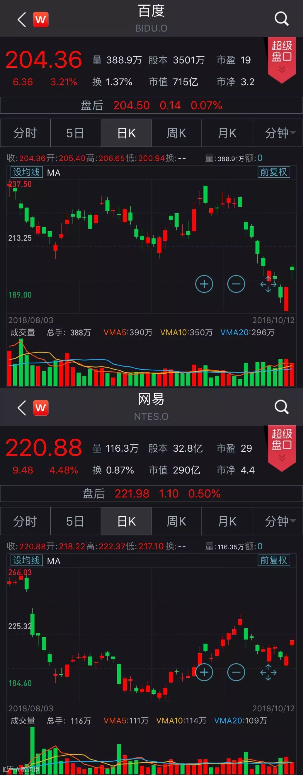 截至上周五美股收盘,百度股价上涨6.36美元,报204.36美元,涨幅为3.21%,市值升至715亿美元;网易股价上涨9.48美元,报220.88美元,涨幅为4.48%,市值升至290亿美元。10月12日晚,网易云音乐宣布达成新一轮融资,投资方包括百度、泛大西洋投资集团、博裕资本等,其中百度为战略投资方。