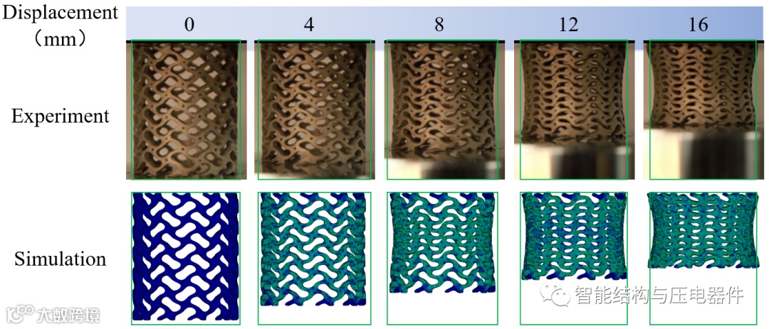 图3 负泊松比管状结构压缩过程的实验与仿真对比图