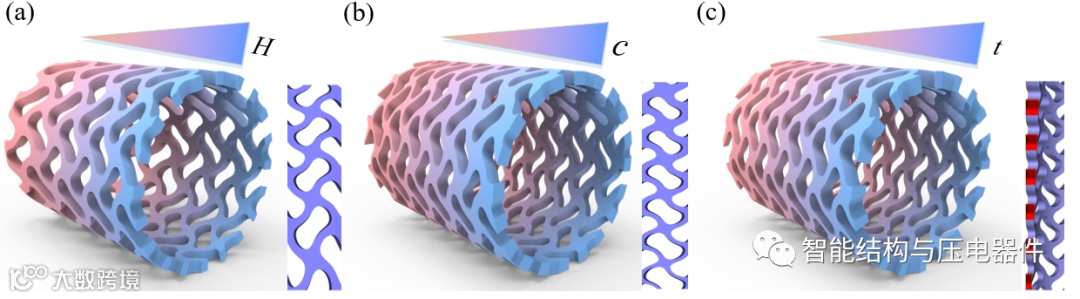 图1.(a)Gyroid三周期极小曲面多孔结构的生成方法;(b)基于三周期极小曲面的负泊松比二维结构生成策略;(c)负泊松比管状结构设计方法