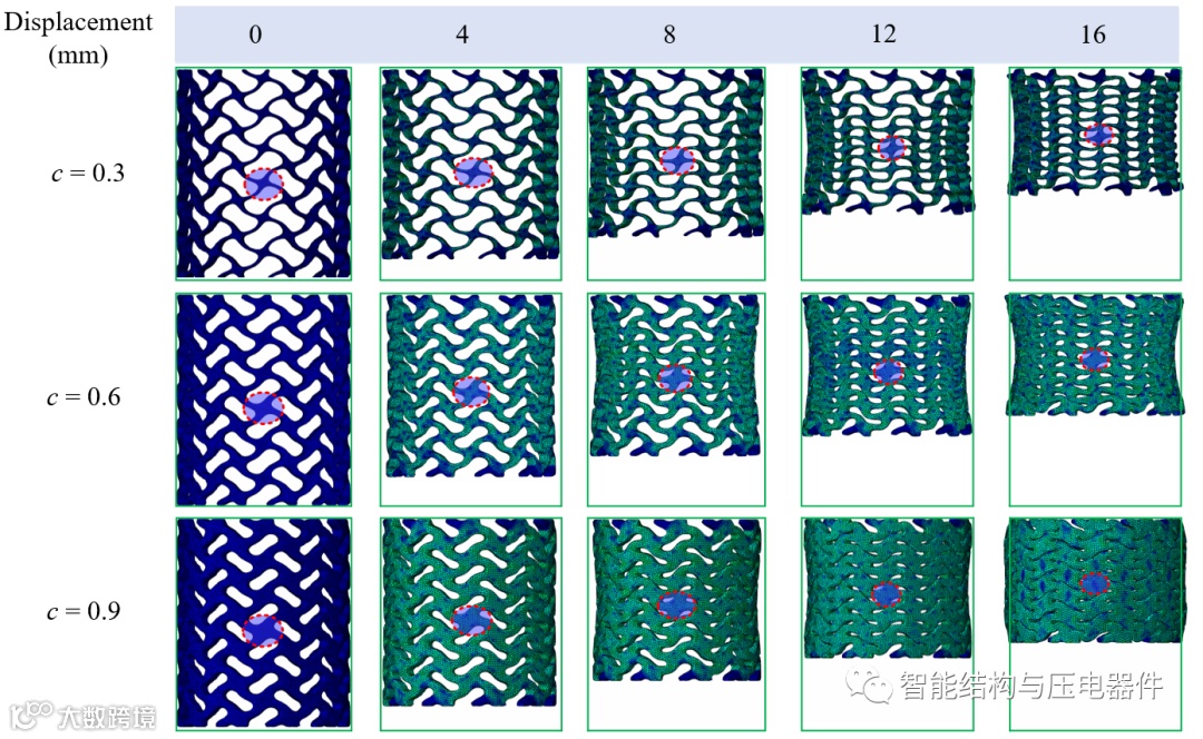 此外,研究团队将设计的负泊松比管状结构利用SLM进行制备,结合实验与仿真对多个关键设计参数,包括水平参数、胞元高度、厚度、周向数量对管状结构在压缩过程中的力学性能(负泊松比特性、能量吸收率)的影响机理进行了深入探究。最后,基于研究结果,利用参数化设计方法设计了三种具有梯度分布的管状结构,并对其压缩性能进行了研究。研究结果表明,采用该方法可以简单、快速地生成具有负泊松比特性的管状结构,并能对其力学性能进行精确调控,为设计负泊松比管状结构提供了一种有效的解决思路,也对性能/属性导向的负泊松比结构材料设计进行了有益探索。本方法设计的负泊松比管状结构在生物医学、车辆耐撞、防护工程等领域具有广阔的应用前景。
