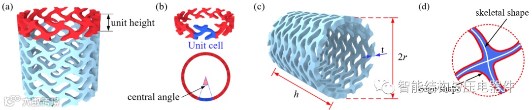 为了实现上述目标,宁波大学智能结构与压电器件实验室研究团队设计了一种基于三周期极小曲面的负泊松比管状结构并对设计参数与其力学性能的关联机制展开了研究。基于Gyroid这一常用三周期极小曲面,通过转换坐标系(笛卡尔坐标转换为极坐标)、选择径向水平参数(1/8周期)、确定胞元参数(水平参数、胞元高度、厚度、周向数量)等步骤生成了具有负泊松比特性的管状结构。