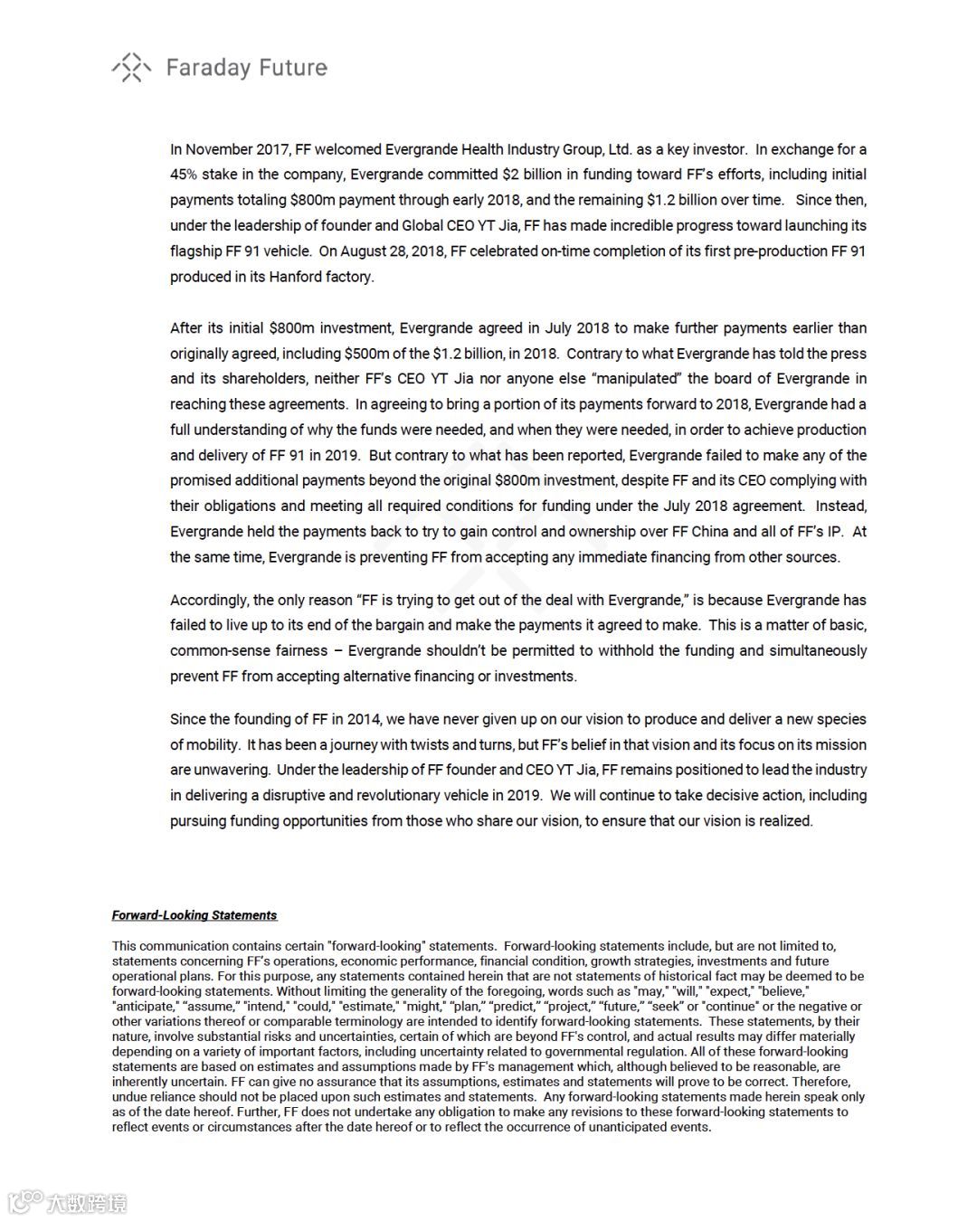 针对恒大健康10月7日晚公告称贾跃亭一方在未达到付款条件下要求付款,且提出仲裁要求撕毁合约。法拉第未来10月8日回应称是恒大未能履行其协议,未能支付其同意支付的款项。“这是一个基本的的公平问题。恒大不应该一边扣留资金,同时阻止FF接受其他融资。”