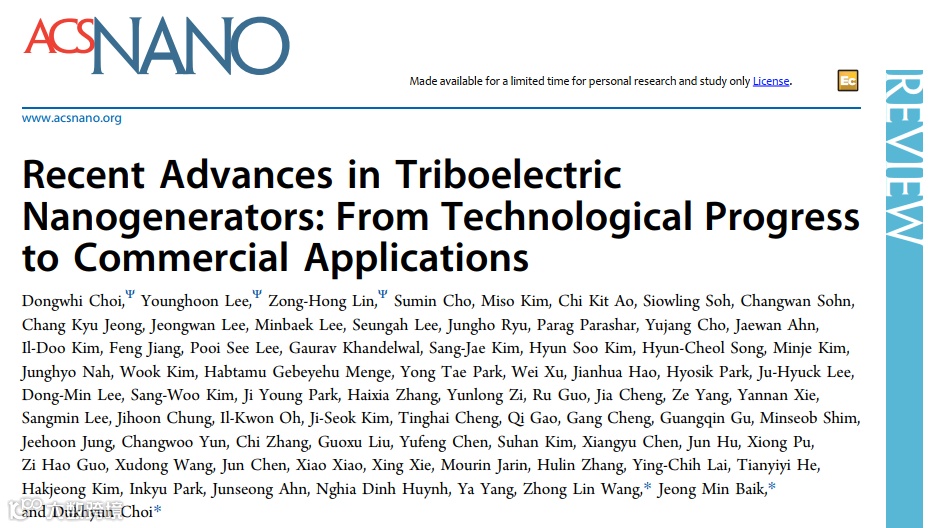 近日,纳米技术旗舰期刊《ACS NANO》推出《Recent Advances in Triboelectric Nanogenerators: From Technological Progress to Commercial Applications》(摩擦纳米发电机的最新进展:从技术进步到产业化应用)。