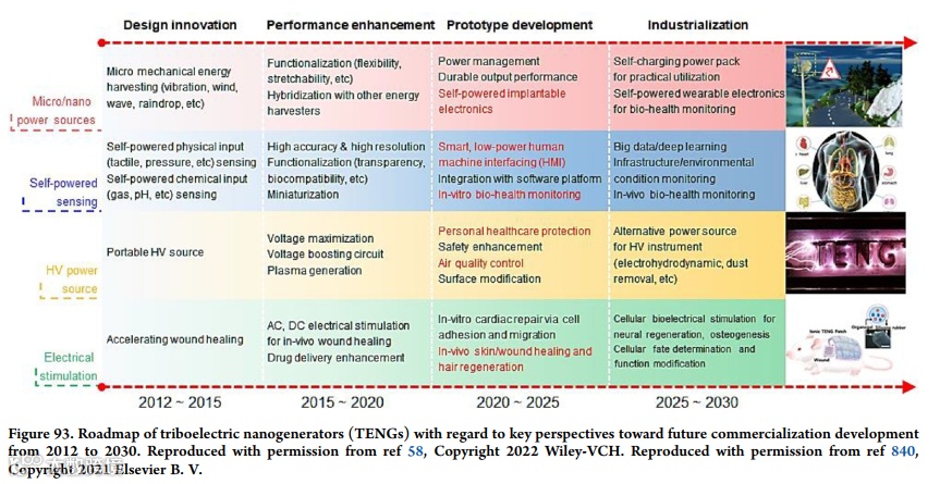 此外,综述还提出了TENG未来发展的方向和路线图,包括了器件性能的提升、材料的多样化开发、器件与系统的集成、大规模制备和商业化应用等。