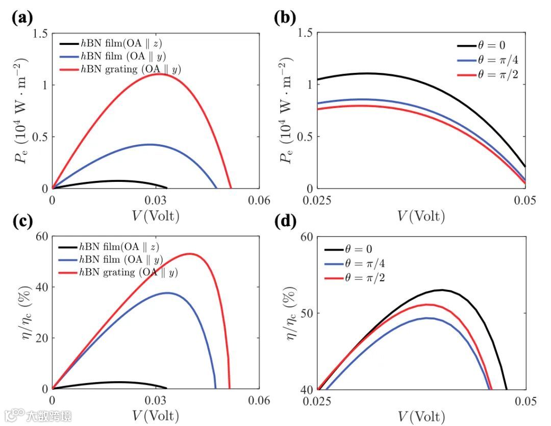 针对以上问题,该工作提出将“扭转”引入近场热光伏系统中,考虑以扭转的氮化硼超表面作为近场热源、被相同的超表面覆盖的锑化铟p-n结半导体作为电池的近场热光伏系统(图1)。热源的扭转包含面外、面内两方面。面外扭转代表氮化硼的光轴相对z轴的偏离;面内扭转代表热源和电池端的两氮化硼光栅在x-y平面内的相对扭转。研究表明,当氮化硼超表面的光轴扭转到y方向时,表面声子极化激元的平面外拓扑转变能够抑制激发(图2),减少热源和电池之间带隙以下的辐射换热(图3),从而实现系统热-电能量转换效率的显著提升(图4)。而两氮化硼超表面的相对扭转则可进一步引起表面声子极化激元的面内拓扑转变,对热源-电池间的近场耦合及系统性能进一步调控(图4)。