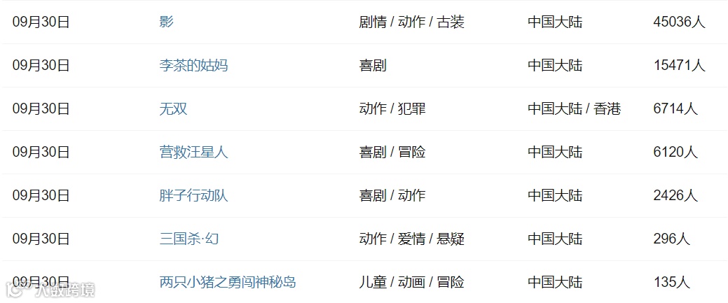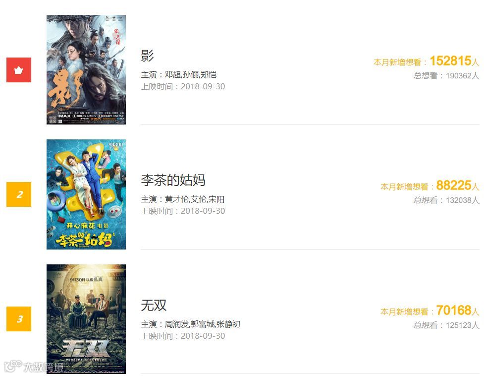 从阵容上看,今年国庆档的电影期待值颇高。根据猫眼电影统计,截至9月20日,期待值最高的三部电影是《影》《李茶的姑妈》《无双》,分别有190363人、132038人、125123人想看。