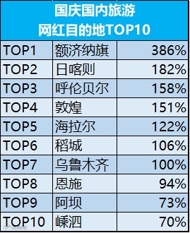 没关系,还有一批“网红”目的地供你参考。比如额济纳旗、日喀则、呼伦贝尔、敦煌、海拉尔、稻城、乌鲁木齐、恩施、阿坝、嵊泗。