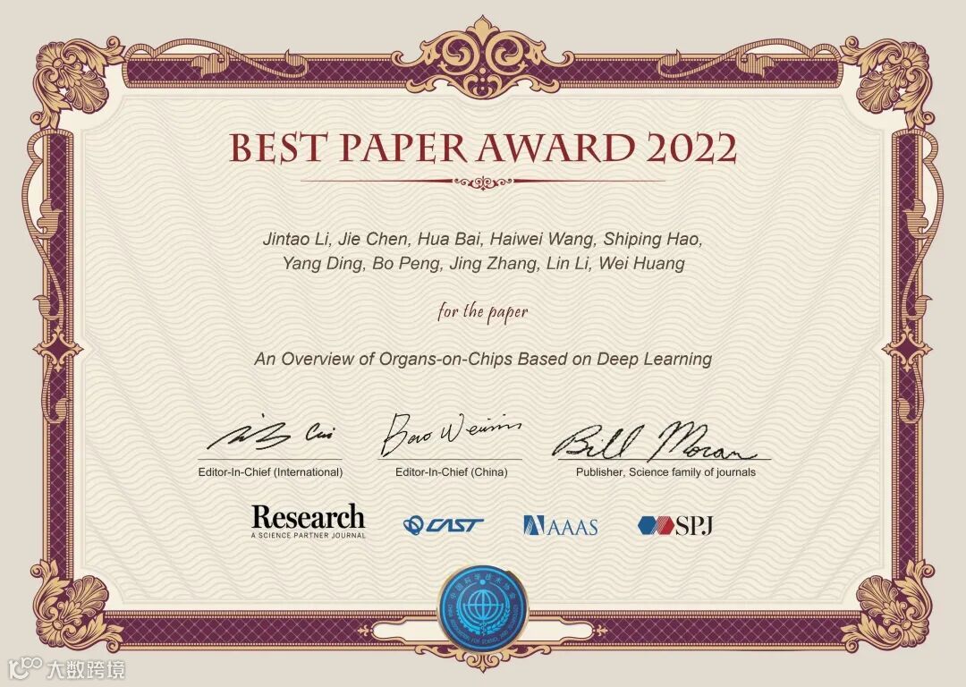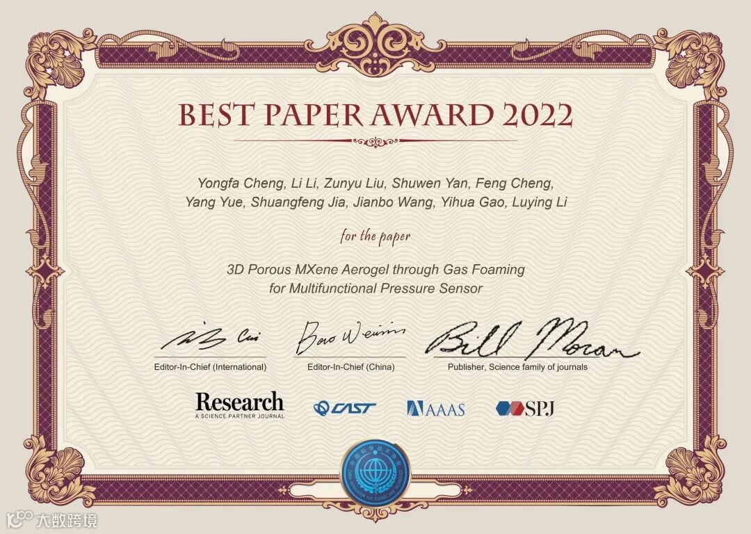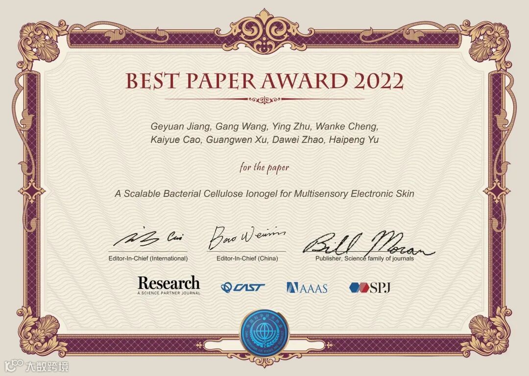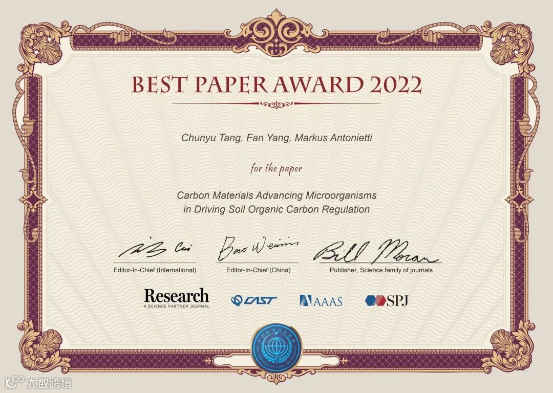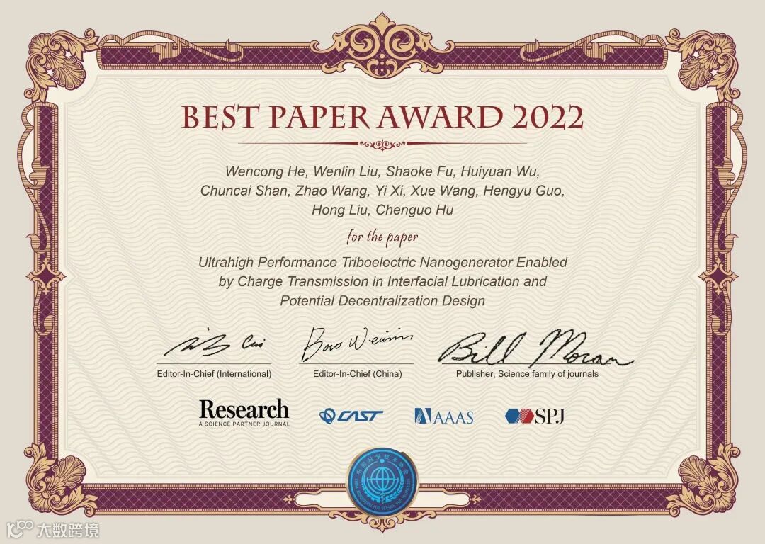《Research》2022年度优秀论文评选,经过了编委推荐候选文章、主编确认、大规模网络投票等环节,共评选出了20篇优秀论文。这些文章将在《Science》的主页进行重点推广、通过《Research》视频号进行可视化宣传、举办优秀论文作者学术报告会,给作者颁发由两位主编和《Science》出版人签字的证书,邀请参加年度编委会会议,主编将向作者约稿一篇,并免费出版。