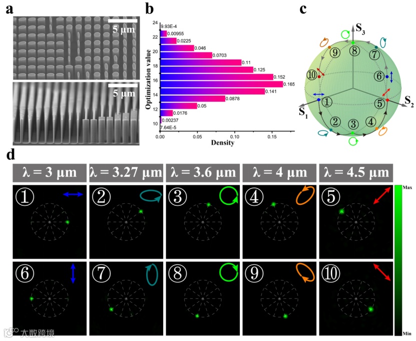 图2. 本征偏振调控超表面的制备与调控。(a)样品加工SEM图;(b)基于混合进化算法的超透镜的优化结果;(c)五波长、十偏振通道在庞加莱球上的表示;(d)选定的五个波长下,不同偏振的聚焦点在焦平面上的分布,插图显示了对应的偏振态。