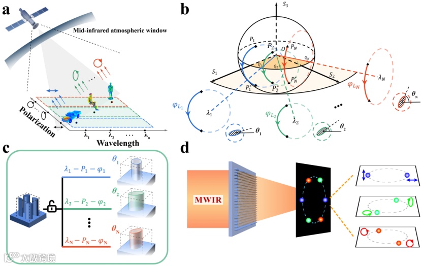 图1. 波长解耦相干单元在光谱维度的多偏振调控。(a)低照度背景下复杂目标的光谱和偏振识别示意图;(b)传统几何相位操控中超表面单元的旋转角θ与本征偏振的关系;(c)波长解耦相干超单元示意图;(d)多色全偏振超透镜的功能示意图。