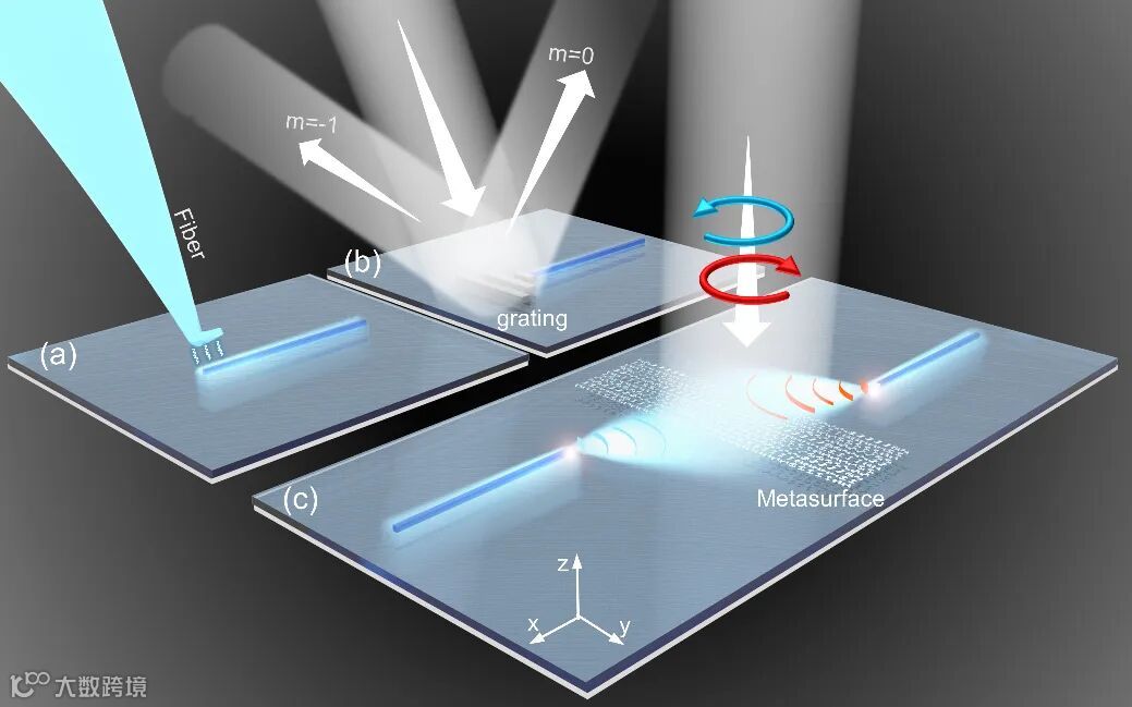 图1 三种不同的片上系统耦合方法。(a)拉锥光纤耦合法。(b)光栅耦合法。(c)超构表面耦合法。